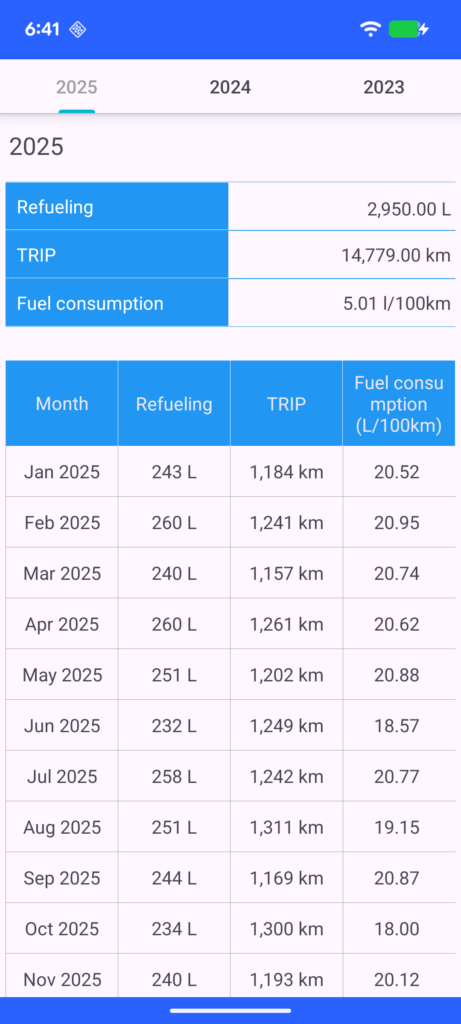 Fuel volume, TRIP and fuel consumption are displayed in line and bar graphs.